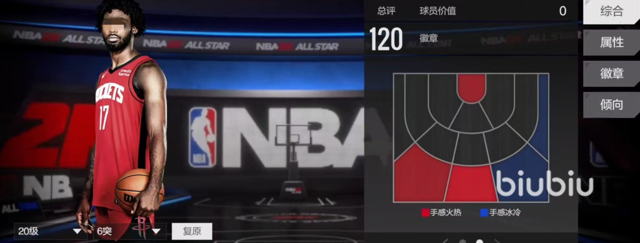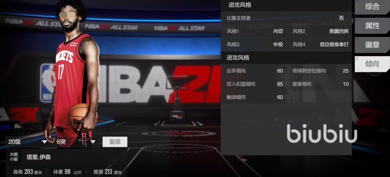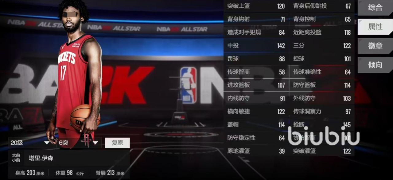 在其他得分手段方面,突破上篮120,近距离投篮118,所以在得分方面还是有着一定的手段。篮板方面,进攻篮板107,防守篮板114,得益于自身的臂展模型,所以在篮板方面也具有一定的优势。防守上,内线防守91,外线防守103,中规中矩。横向敏捷122,盖帽114,抢断145,抢断方面的属性还是比较亮眼。此外他还拥有122的突破灌篮和39的原地灌篮,突破灌篮这一项属性,能够再增加一项得分手段。