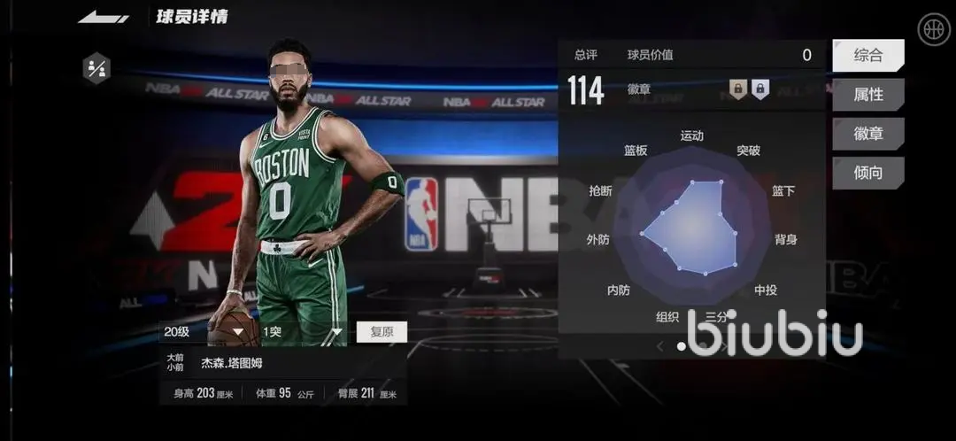 塔图姆在游戏中的定位是大小前锋。其实这都得益于他高挑的身材,有着203cm的身高。以及高达95kg的体重,但能让他在球场上中轻松防守敌人,可避免对方进攻还可以快速进行回防。他最出色的能力就是外防,可以轻松用双手展开防住敌人。