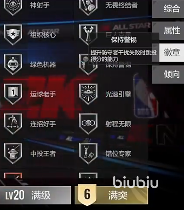 对于徽章方面的话最好佩戴上保持警惕,当你开始跳投时就可以避免被对方抢到。能让你光速获得更多的分数,然后也可以搭配射程无限以及神射手的徽章,又能够让他在很远的距离中也可以胜利的投篮,如此就能增加投篮命中的概率,再搭配其他徽章更是让他如鱼得水。
