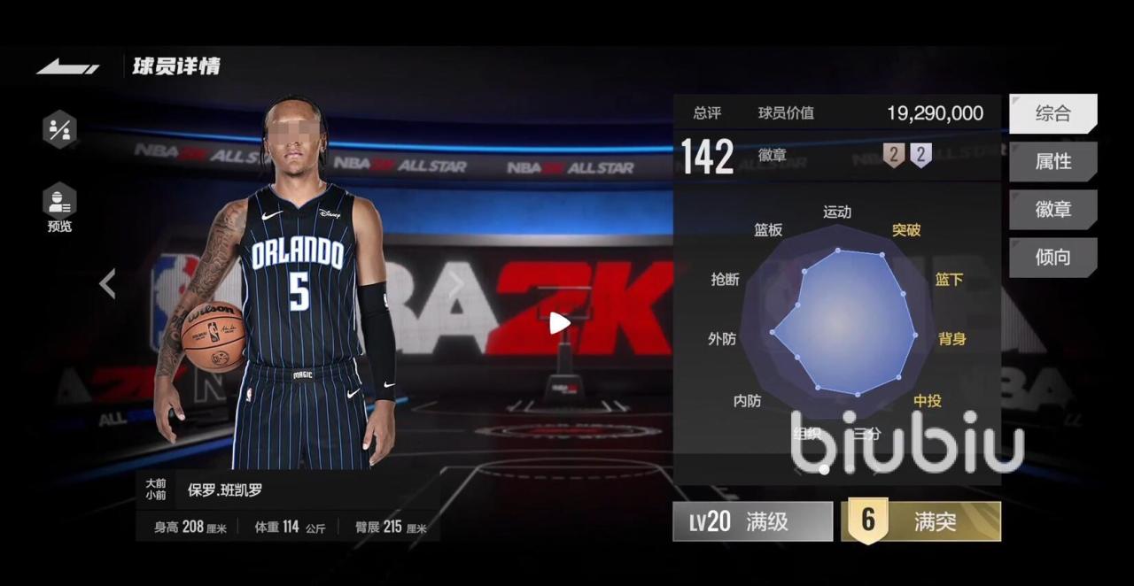 徽章方面,班凯罗拥有铜品质运球好手和无畏终结者,以及银品质对抗冲框和弹跳大师,与他的模型和属性契合度高,能进一步提升其在运球突破、对抗终结和冲框等方面的能力。