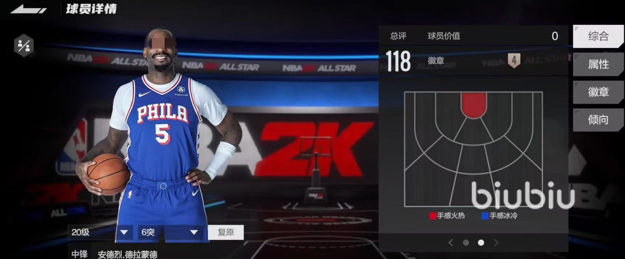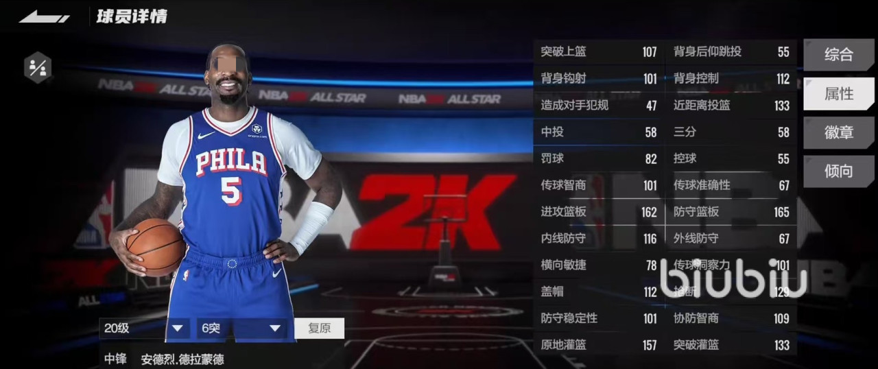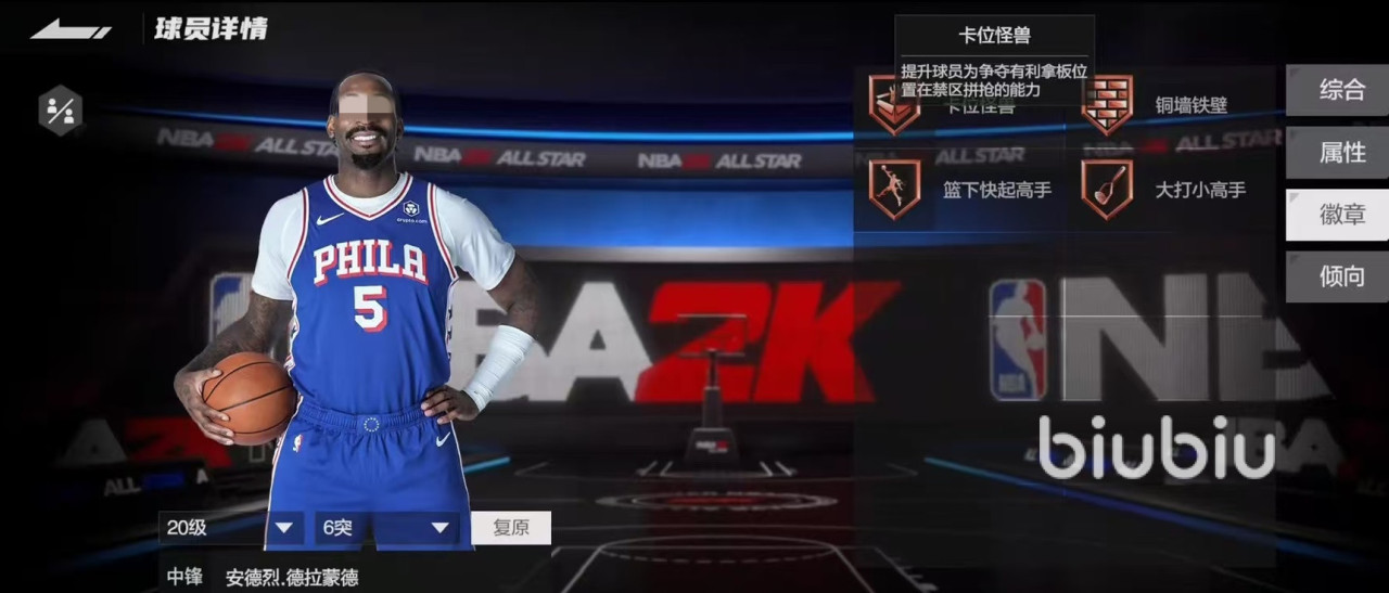 除了这些属性之外,德拉蒙德还具有4个铜徽章,分别是卡位怪兽,铜墙铁壁,篮下快起高手和大打小高手。主要生效的就是卡位怪兽和篮下快起高手,其他两个在实战中用的比较少。这两个和自身的属性非常贴合,实战中其实德拉蒙德只需要做两件事,第一就是跑到篮下,第二就是抢到篮板,其他就都不用再管了。