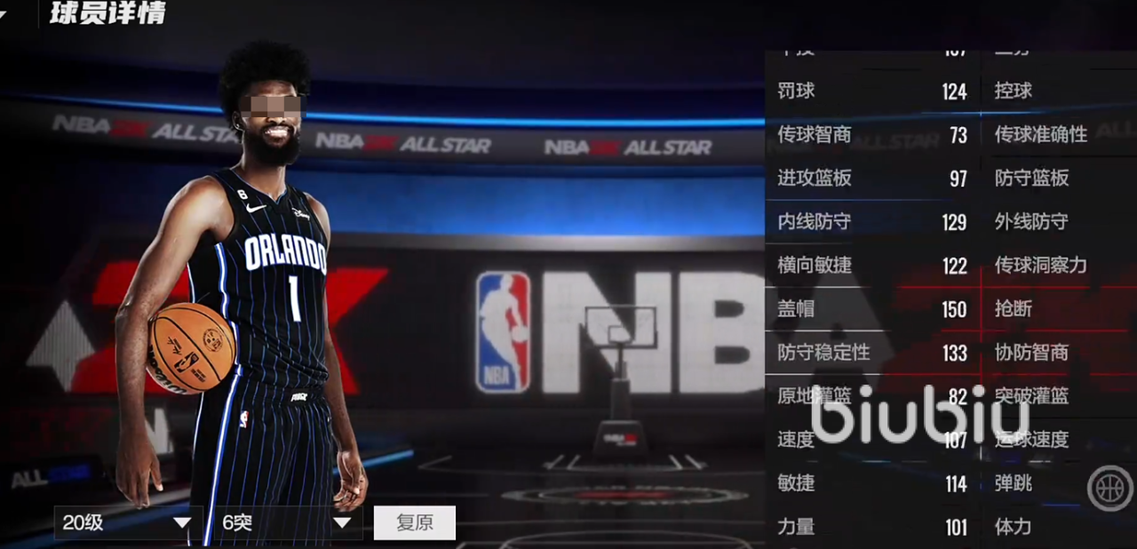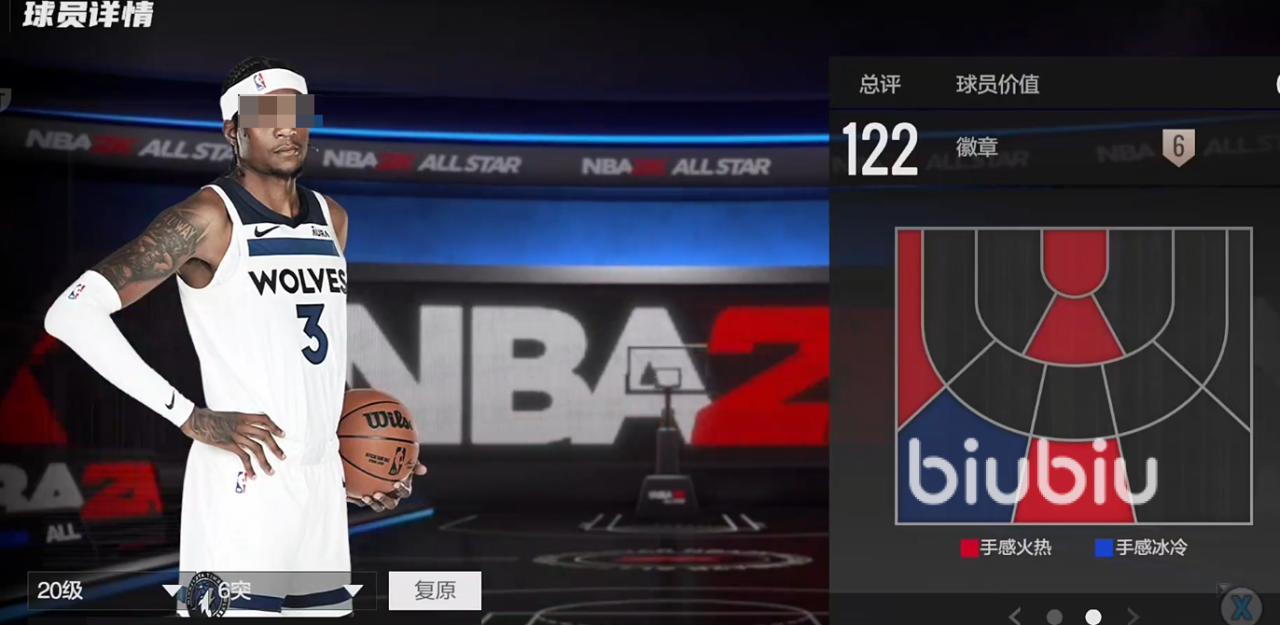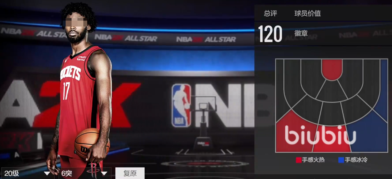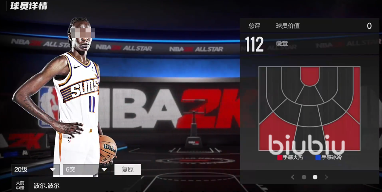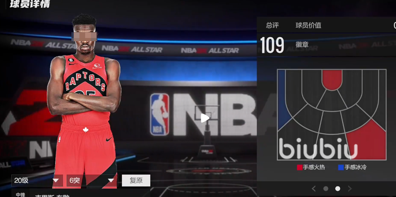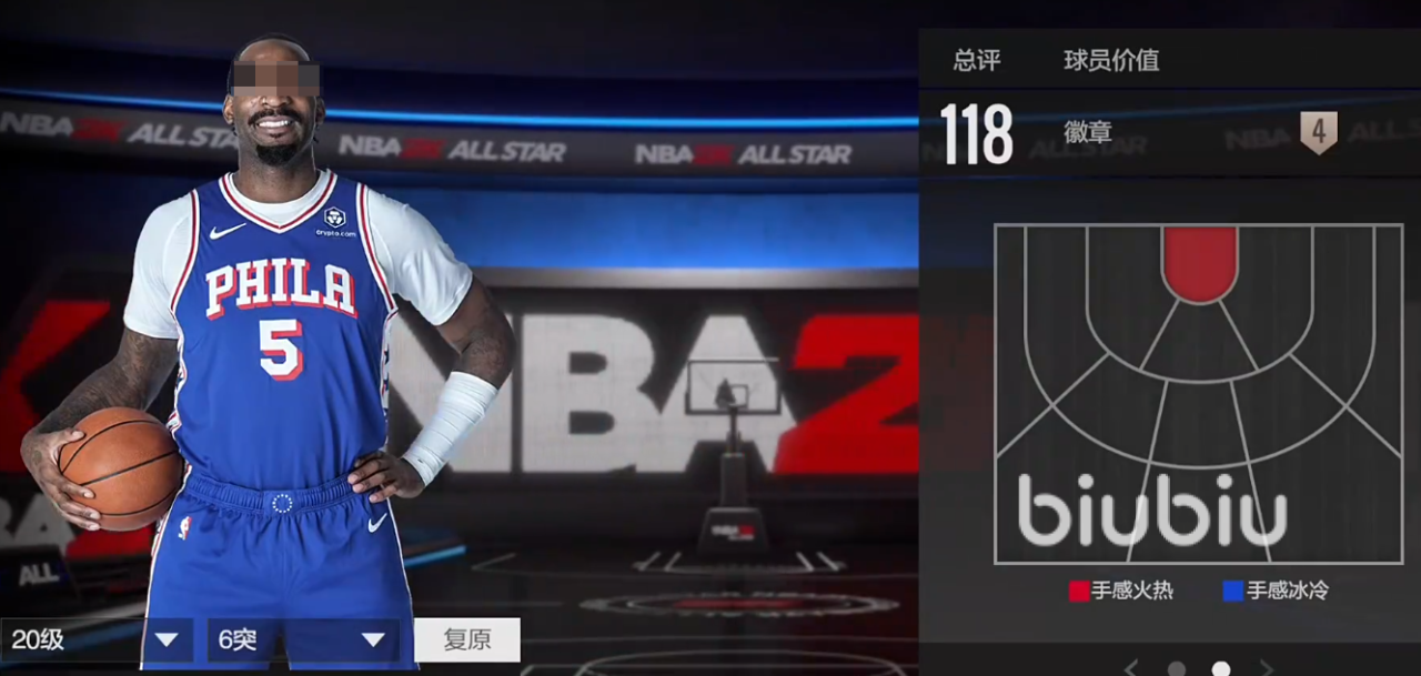 2米06的身高,224臂展,109的总评,模型不算特别突出,但是够用,投篮在右侧45度的三分算是热区,有着114的三分,具备一定的三分能力,105盖帽。暂时没有徽章,是平民玩家里比较好用的空间型内线,属于矮子里拔将军。