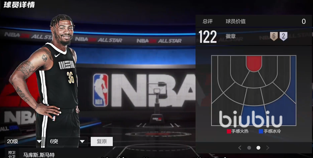 马库斯·斯玛特,俗称聪明哥,控卫分卫定位,总评122,投篮热区一般,但好歹是全区域覆盖,有一定的三分能力,内防和外防都不错,尤其是外防有147,横移抢断都很高。拥有徽章:弹跳大师(银)、争球狂人(银)、护踝(铜)、防守干扰(铜)、缠绕(铜)、盯防(铜)、无球跑位克星、挡拆躲闪者(铜)。总的来说是个非常优秀的外线防守者,外线防守很强,但其它方面有不小短板,适合锁后卫。