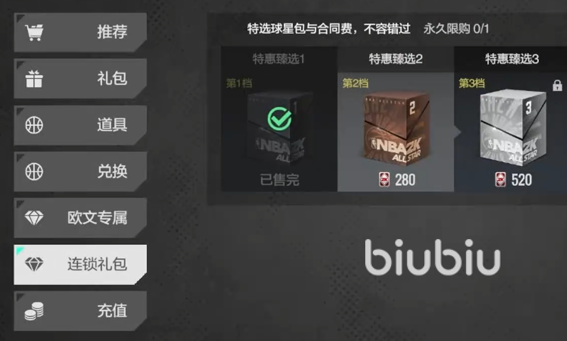 接着欧文是一个特别厉害的球员,然后欧文专属的话全部都买掉。就可以直接将它养成为最强的球员,让你一步到位。对于连锁礼包的话,大家切记连锁礼包的价格是特别高的。然后第一档的性价比最高,如果你实在想买的话就买第一档的就行了。