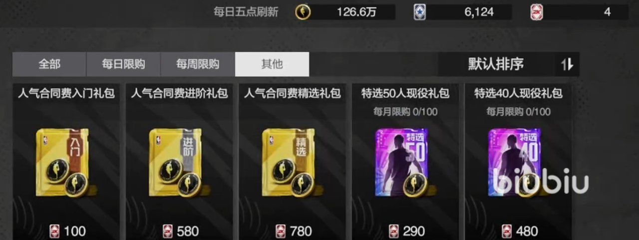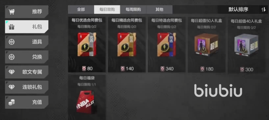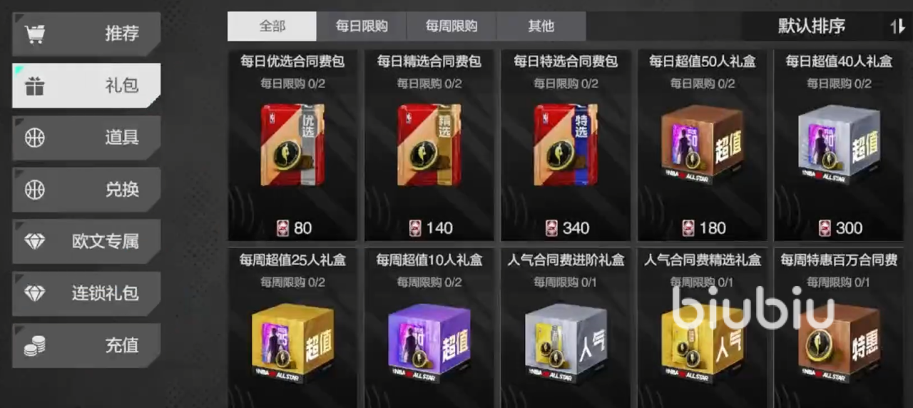 首先进入商城之后可以看见几个选项,分别是礼包道具兑换以及欧文专属、连锁礼包和充值。礼包方面的话更推荐大家购买一些每日限定礼包,保底获得大量的合同费。然后合同费的话可以让你去租赁一些球员,毕竟我们在战斗时需要培养大量的球员。