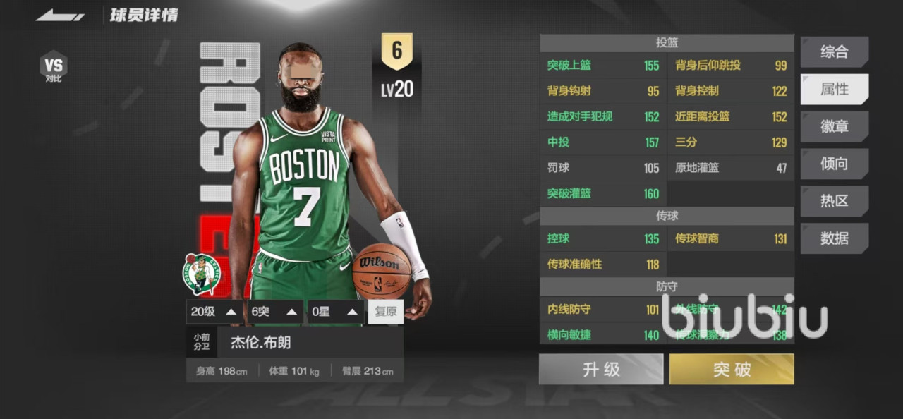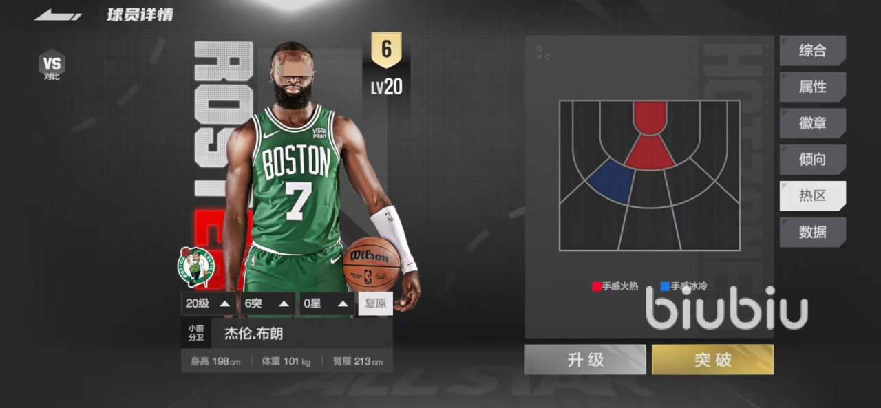 具体属性方面,在投篮中拥有155突破上篮,157中投,129三分,160突破灌篮这几项抢眼的数据,可以说在得分方面还是比较出色的。既可以利用快速冲击能力直接在篮下上篮或者是灌篮得分,也可以找到机会在外线直接中投或者是去投三分。需要注意的是,该球员在外线没有热区,只是在左侧45度有一块很小区域的冷区,要注意避开。在防守方面外线防守142,内线防守101,横向敏捷140,防守稳定性133,外线防守是绝对优势,内线防守属性虽然低一些,但是也并非完全不可用。