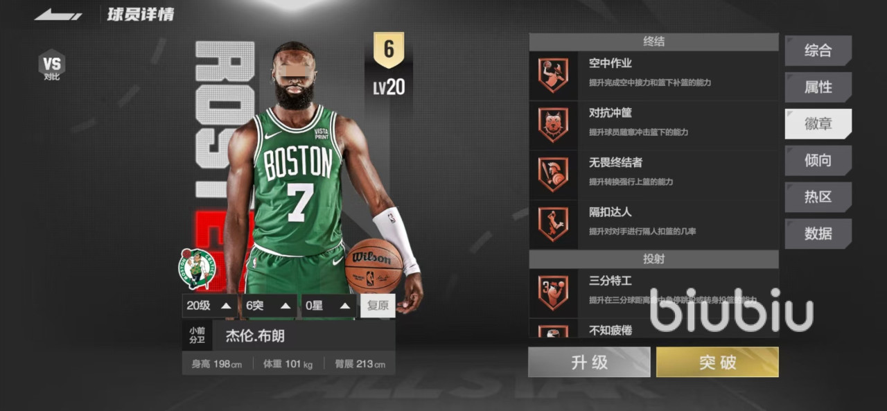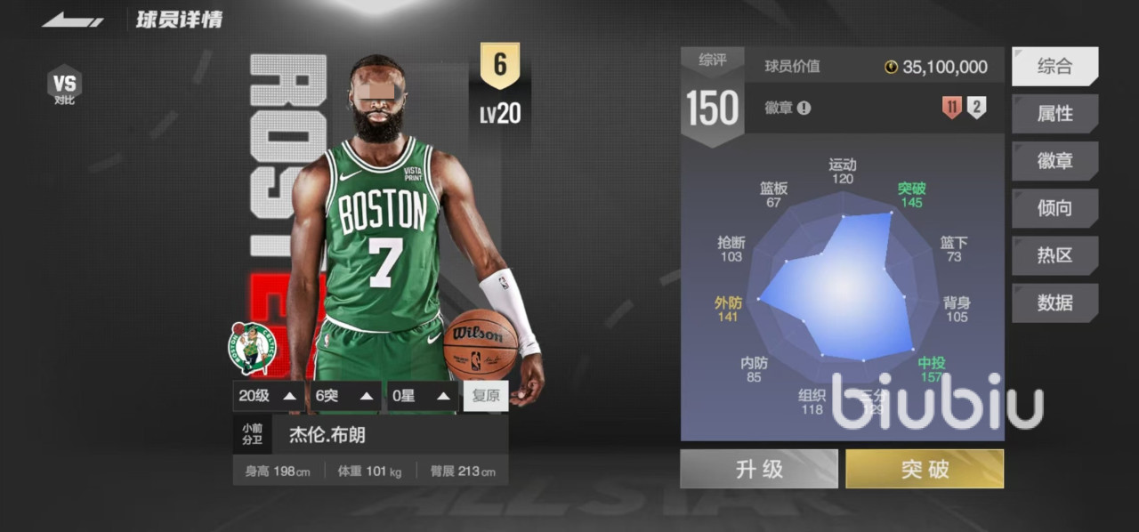 这里的布朗指是游戏中的杰伦布朗,也是一名非常出色的球员,无论是在小前锋位置还是得分后卫位置,都展现出了强大的实力。目前在全明星这款游戏中,也是价值非常高的一张卡,他的身高198厘米,体重101千克,臂展213厘米,虽然身高不高,但是臂展却比较出色。他的突破、中投以及外防方面都是可圈可点的,同时还拥有11枚铜徽章和两枚银徽章,展现出了自身在场上的价值。