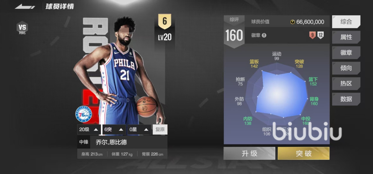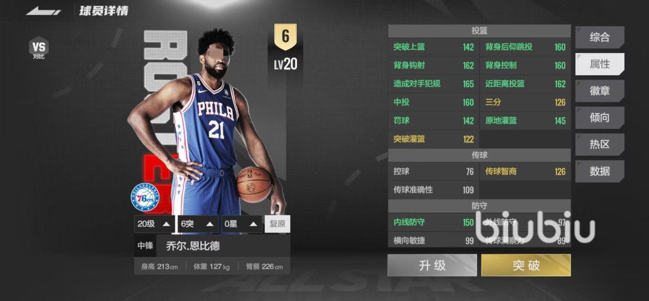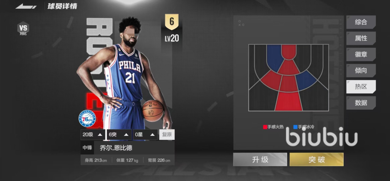 除了大家也可以看出在热区覆盖方还是比较广泛的,而且它的这些个热曲都是比较舒服的位置,可以很好地完成投射。投篮方面,属性大多数都非常抢眼,例如中投160,三分126,突破上篮142,背身后仰跳投160,近距离投篮162等,还有145原地灌篮和122突破灌篮,得分手段全面。在投篮这一方面,乔尔恩比德绝对是属于中锋中极为出色的一个。防守方面的属性也不落下风,尤其是在内线防守方面达到了150可以防住很多内线球员,但是外线防守就比较低了,只有97,还有126盖帽,99的横向敏捷是自身硬伤。