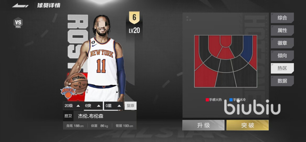 先来看一下在投篮方面的属性,突破上篮165,中投152,三分135,罚球138,主要的得分就是依靠突破上篮或者是投篮。在热区方面的还是比较多的,两侧以及左45度区域都是手感火热地区,这些位置投篮再配合上自身属性准确率很高。传球方面,控球157,传球智商165,传球准确性160,展现出了一名控球后卫的精湛能力,这个属性完全对得起自身能力。防守方面虽然拉胯一些,但是横向敏捷131还是可以的,其他属性内线防守73,外线防守107就很低了,抢断也只有48,盖帽39,所以说防守方面是绝对的劣势。