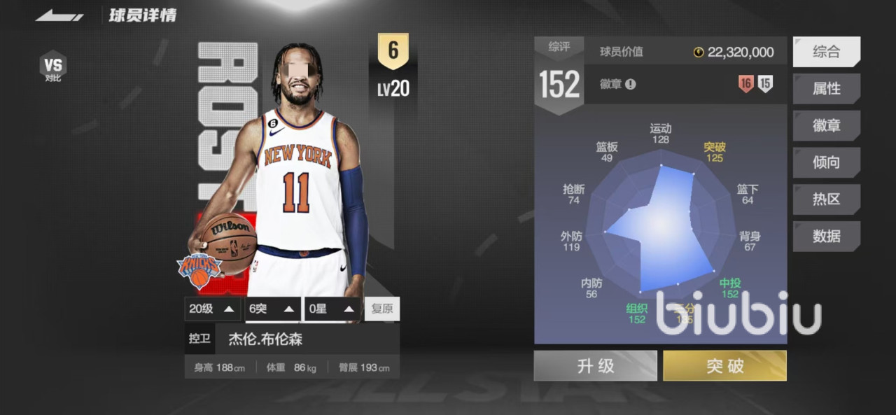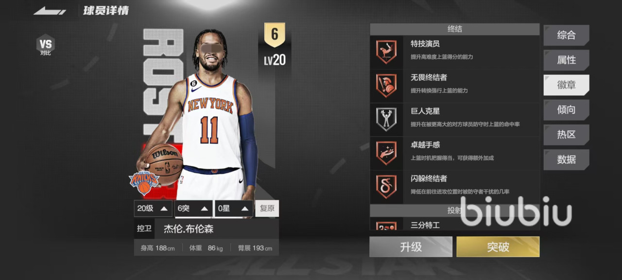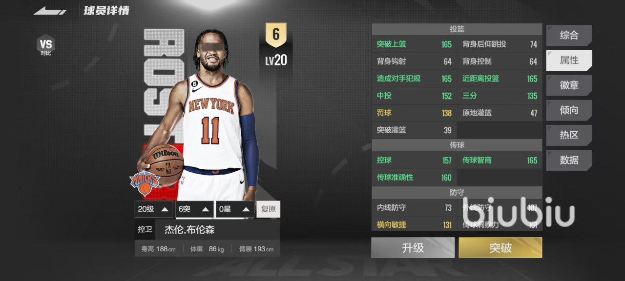 布伦森全称是杰伦布伦森,是一名很出色的控球后卫,他的身高188厘米,体重86千克,臂展193厘米,在后卫中还是属于中规中矩的模板。作为一名后卫,他的突破能力非常强,组织、三分和中投这些属性也都比较抢眼,更重要的是他拥有16枚铜徽章和15枚银徽章,在徽章方面就碾压了很多选手。徽章的分布方面,其中投射一共有12枚,组织有14枚,终结有5枚,除了防守之外,其他方面几乎都可以打出很好的效果。