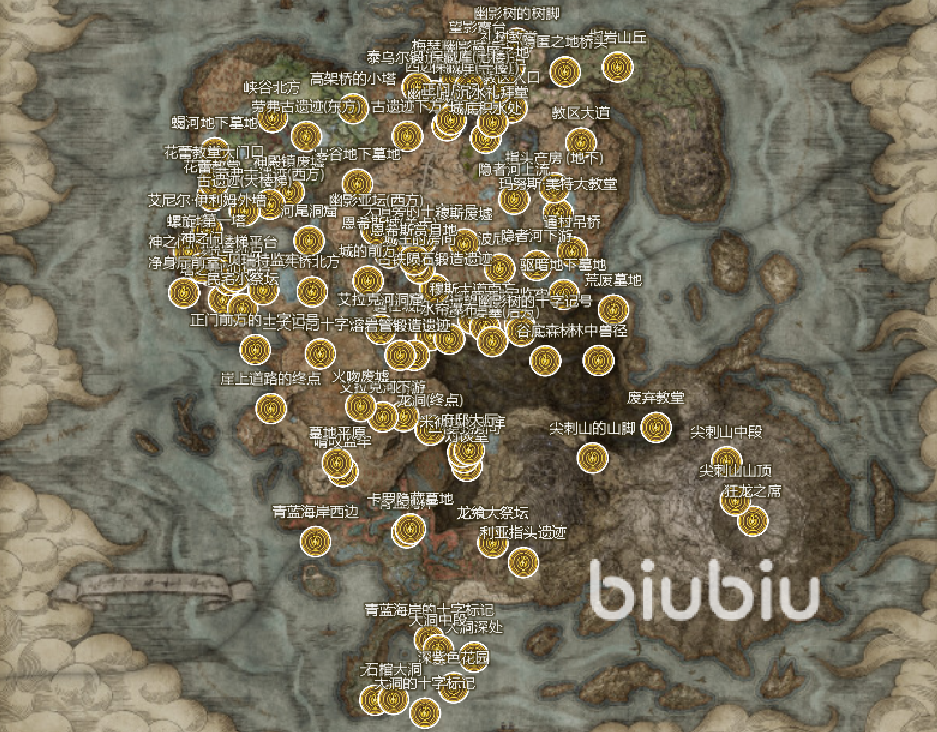 新地区幽影之地一共有105个赐福,这里可以凭借插图来看到他们完整的分布位置。赐福说白了就是传送点,所有的魂系游戏都有大量的这种传送点或者说休息点,玩家只要进行互动就能点亮使用,只不过它们的名字不同,有的叫神龛有的甚至叫冥想处,这些名字都会根据作品的题材而变化。