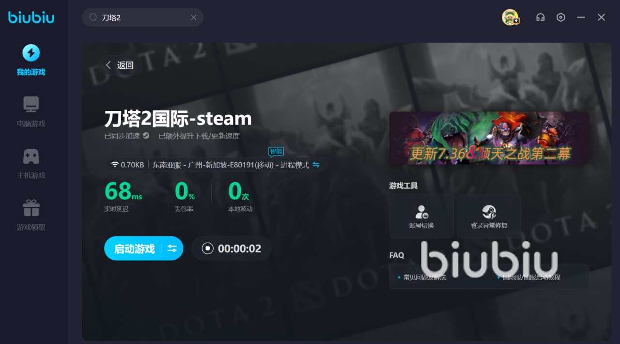 刀塔2是一个很注重细节以及发育的对抗游戏,一旦对线期被敌方玩家打爆的话,后续想要再次发育就会变得异常艰辛,可能几十分钟后游戏就结束了,对于玩家的体验是很糟糕的,而且有部分玩家的水平还是很不错的,但是由于网络的问题,导致经常需要重新连接以及闪退,而为了解决这种情况使用biubiu加速器就能起到不错的网络净化作用,并且新人在注册后便获24小时免费加速,以及新老用户使用兑换码【biubiu不卡顿】可获3天免费的使用权哦!