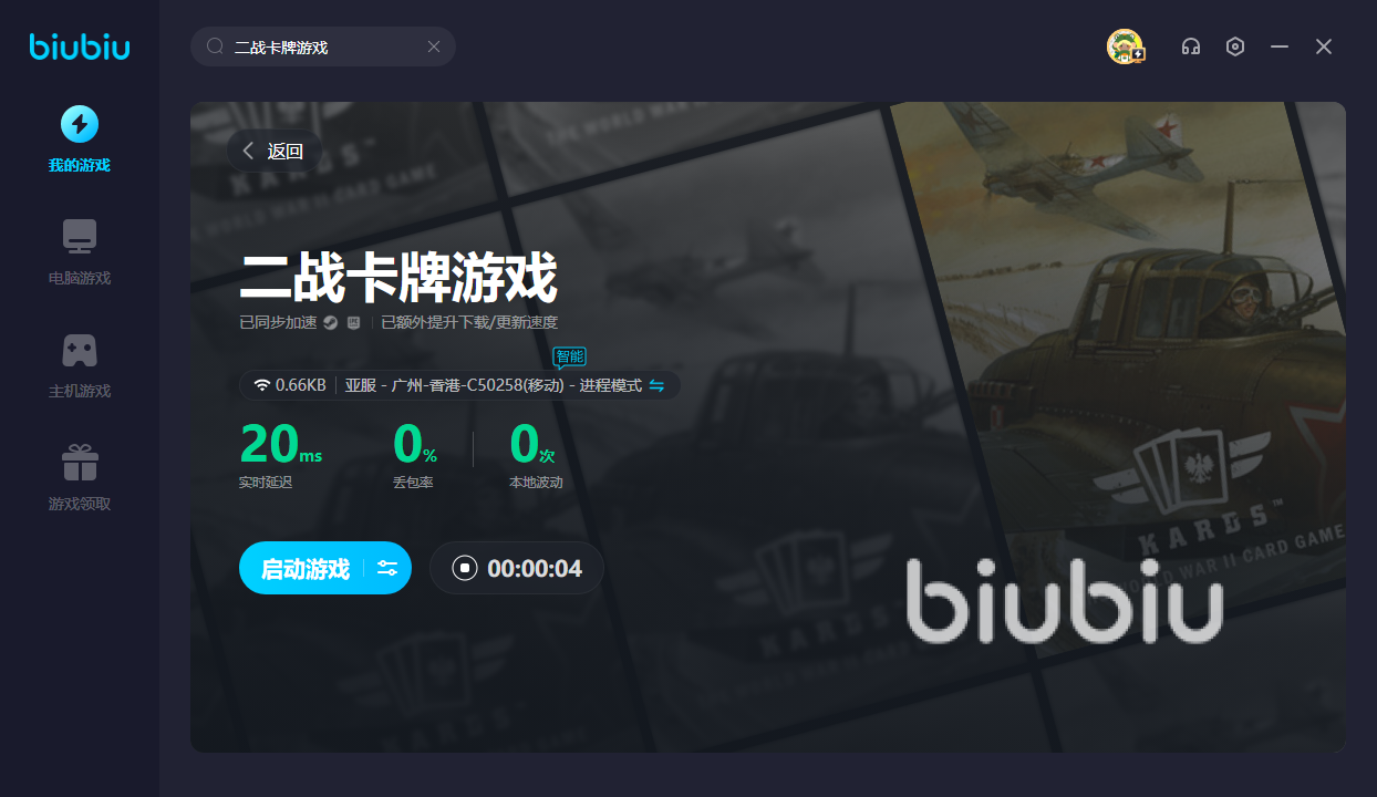 二战卡牌游戏虽然好玩,不过却暂且没有国服。只有用了biubiu之后,方可优化网络,让你进入真正的战争年代。若是初次体验的话,新人可领取24H的免费加速;此外新老玩家还能使用【biubiu不卡顿】,便可额外领取三天免费加速。进入主页后太卡顿的话,可能连最基础的卡牌搭配都无法做到。使用加速器后,即可轻松组建出强大的卡牌阵容。让你有更高的胜率拿下比赛,如果延迟高的话,就会影响你的出牌速度。有了加速器后,方可降低延迟,每次都可操作自如。