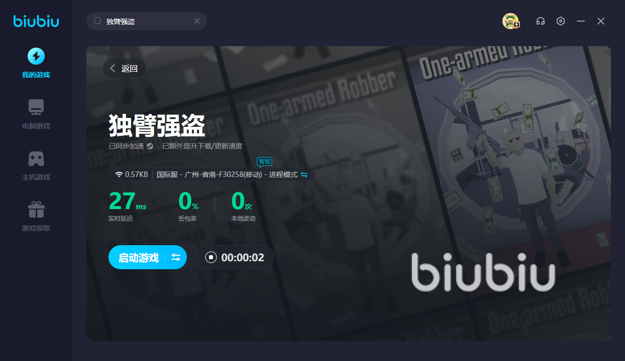 独臂强盗作为闻名遐迩的国际游戏,如今仍然暂且没有国服。为了成为一名合格的国际大盗,宝子们可好好利用biubiu。经过一番畅快加速过后,就能获取成为知名大盗的资格。若是没有玩过的宝子,便可通过新人可领取24H的免费加速福利,试玩一下;另外新老用户可输入【biubiu不卡顿】,便可领取三天免费加速。在执行任务途中卡顿的话,那就很容易被人抓到。使用加速器后,才能轻松hold住全场,好好的谋略一番。