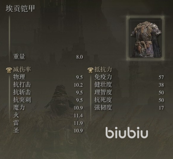 埃贡的套装最重的衣服部分,仅有8.0的重量,比一般防具少一半,并且给的属性也比散件好不少,虽然减伤没多高但是异常状态抵抗有好几十,如果你是个法师或是喜欢用弓箭的话,埃贡这个系列会让你身轻如燕。
