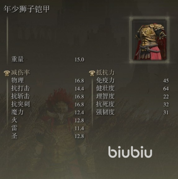 最后就是年少狮子套,也就是新版拉塔恩的服装,数值是新版本最高的。不过考虑到作为最终BOSS的防具,收藏性大于属性本身,毕竟拿到基本就通关了。在外观上和本体的拉塔恩外观套装没什么区别,原版是碎星将军的版本,这时少年时期的版本,配色上也相差无极,极高的重量只适合近战角色使用。