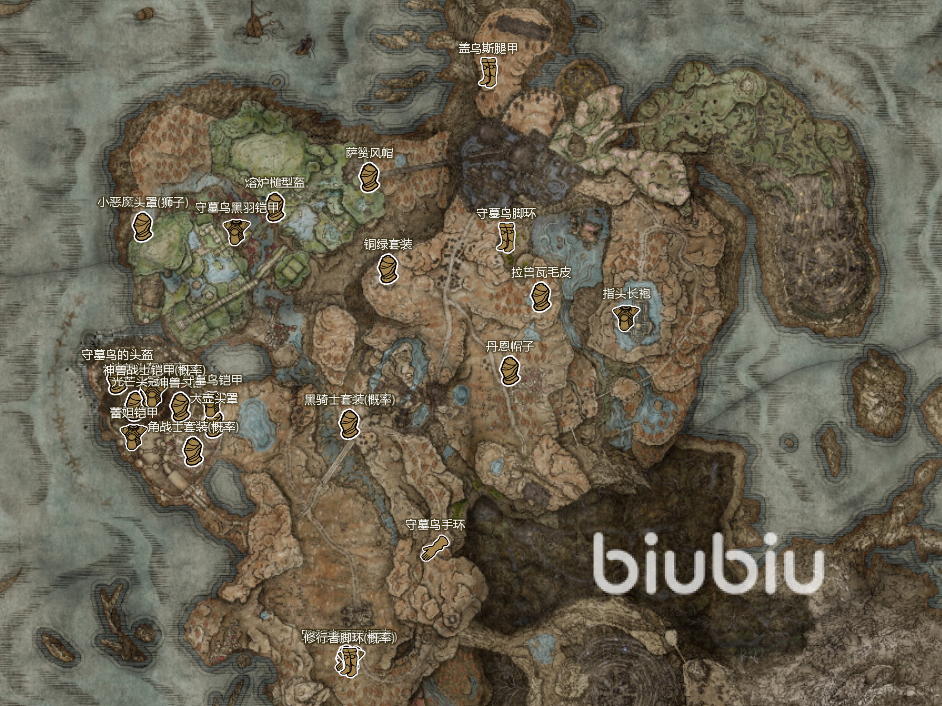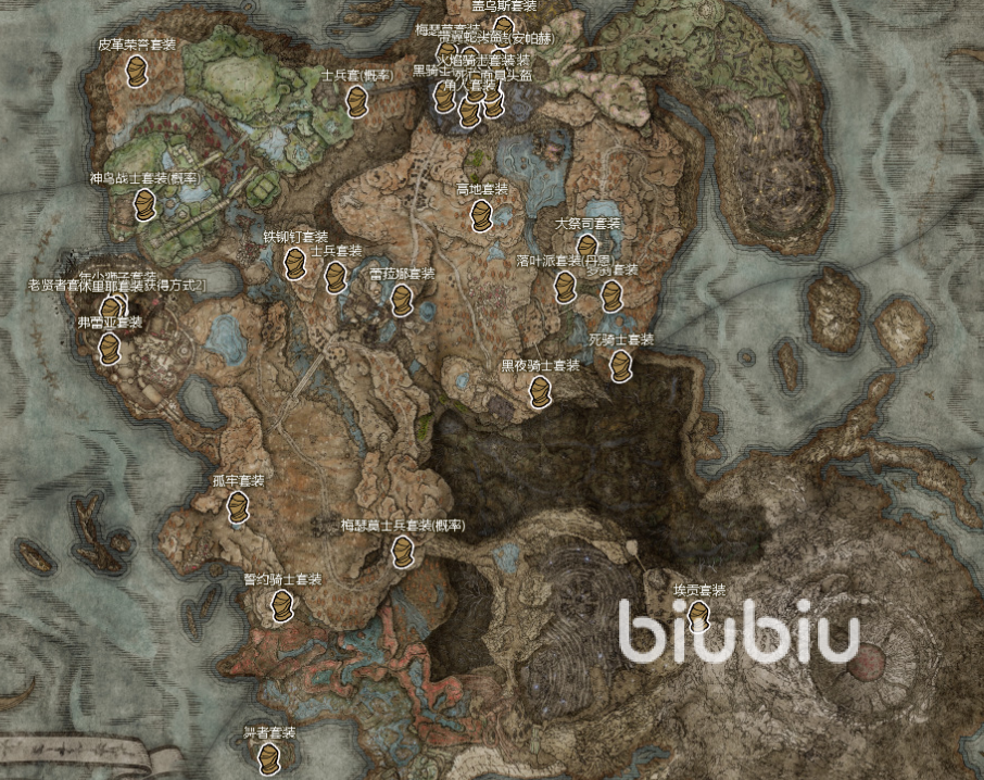 另外还有套装防具,这些属性明显就好很多,外观方面也更加拉风有气势,有一些甚至可以当作毕业装备,具体的收集地点插图也为大家标出来了。如果你觉得每件装备都拿非常的麻烦,也没有什么必须全收集的必要,那只挑选几件值得用到通关的防具也没问题。