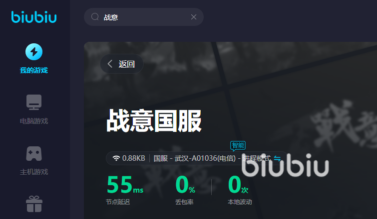 它的使用感受是极佳的,整个ui界面十分简洁,所有的游戏都有清晰的类别划分,有PC端以及主机端两种游戏方式,大家如果觉得在海量游戏库当中慢慢翻找战意国服的加速方式很慢,可以利用名称进行搜索,很快就可以查找到加速页面了,找到国服版本,轻轻一点,立即开启加速服务。