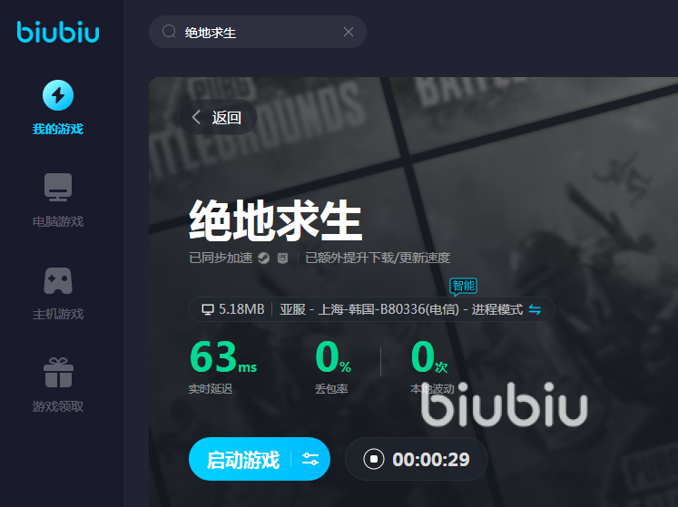 大家对于射击游戏的兴趣度一直都很高,尤其像绝地求生这样融合了多种玩法的游戏,带来的游戏体验是超乎想象的。也有玩家表示游戏特别卡,或者是一加入战斗网络延迟就往上飞,怎么操作都不流畅,很影响心情。其实大家可以用biubiu来解决这些问题,只要加速完成以后,就能感受游戏从登录到对战结束都非常流畅,丝毫感觉不到延迟的存在。