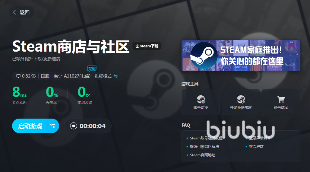 大家可以用biubiu来降低博德之门的延迟,具体的操作方法是先在软件加速steam平台,再利用同步到平台的网速来玩游戏,这样不仅感受不到延迟的存在,玩游戏还很流畅,大家就可以好好地来玩一玩博德之门了。