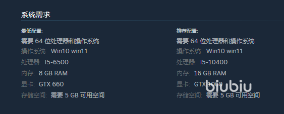 那么此游戏对于电脑的配置要求高吗?结合下图我们可以得知,该游戏推荐的配置也仅仅只是需要满足win10或者win11的系统,CPU达到十代i5,运行内存达到16GB并且显卡是1060就可以畅快游玩了,所以该游戏是不吃配置的, 现在的家用电脑玩它是绰绰有余的。