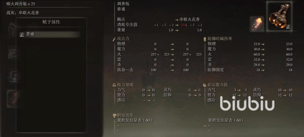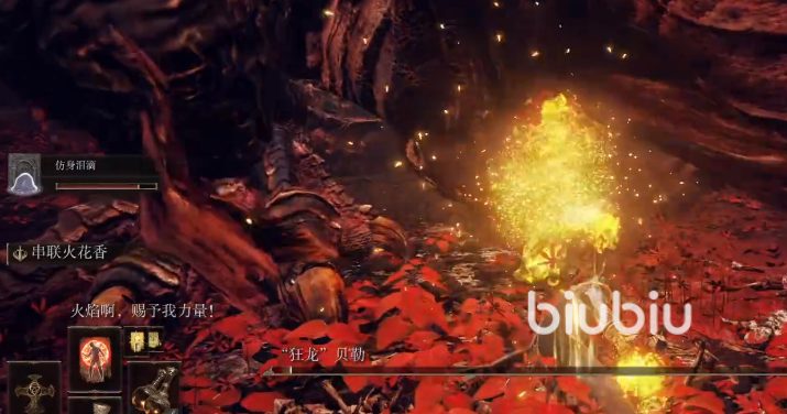 等小球爆炸之后,靠近拾取就能获得战灰:串联火花香了。这个战灰配合癫火调香瓶用效果最好,在面对超强boss拉塔恩的时候,最多四下就能秒掉这个boss。但是这样玩也有问题,就是串联火花香没有削韧的能力,无法使boss进入硬直状态,如果对面一些机动性较高的怪物时,它的效果就比较差了。为了弥补串联火花香没有削韧的缺点,大家可以多带一点速度属性,让角色跑起来,主打一个消耗。