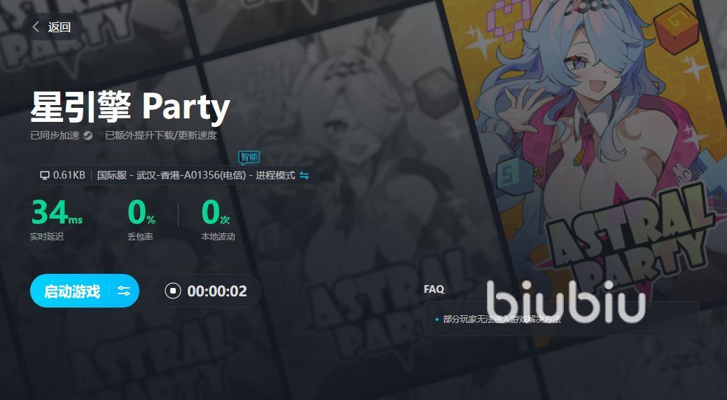 进入到biubiu加速器的主界面之后,直接编辑星引擎Party游戏名称就可以看到相应版本,选择对应区服启动加速,当然也可以将其添加游戏列表当中,方便第二次的使用,每一次都只能给一款游戏加速,一键启动模式直接放置后台不会有任何的干扰。当然退出游戏记得停止加速,如果大家忘记了也没关系,重启进入其他游戏的时候会看到相应提示的。