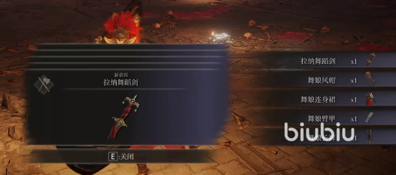 击败舞娘之后就可以获取到期待已久的舞娘套装,同时还可以获得拉纳舞蹈剑。这件舞娘套装以红色调为主,可以说是游戏中最好看的女性角色套装之一,如果你还没有拥有这件套装的话,就可以参考小编的攻略去获取这件套装,还是很值得一去的。