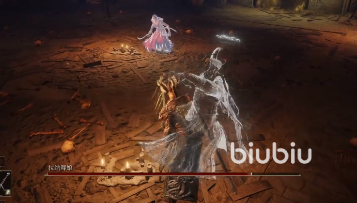 出来后南方无名灵庙就在对面的山坡上,找到上去的路进入无名灵庙。这里的守护者叫做拉纳舞娘,它的强度并不是很高,是四个灵庙守护者中最好打的一个。作为人形怪她的韧性不高,可以使用狩猎巨人来打,打了两套之后就能硬直了,战胜她还是很轻松的。