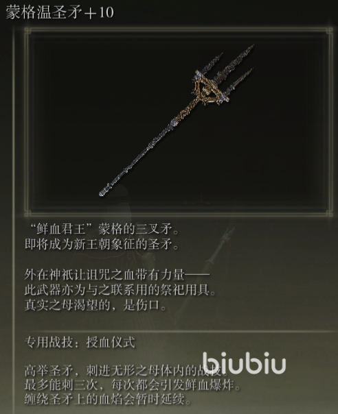 玩家只要击败位于鲜血王朝的BOSS蒙格,凭借他的追忆就能兑换其武器。或许难点就是该如何对付这个BOSS,他的开场动画会让他从鲜血中现身,手持一把三叉戟,这就是你要兑换的武器。无论你是什么职业,上来先召唤分身,也就是仿生泪滴,之后直接往后退,因为他会向前洒一圈血,并将其化为火焰。