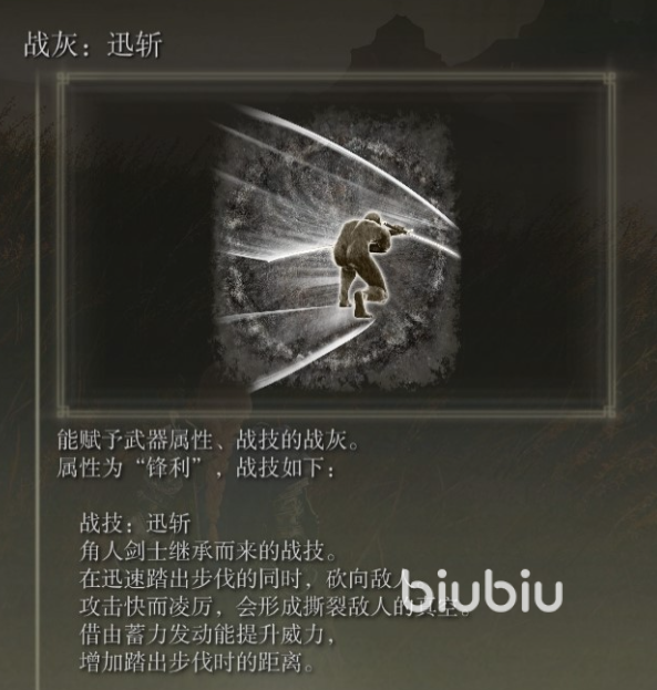 反手剑类武器使用的战灰,在做完角人支线后就能拿到。如果你习惯使用这类武器,那么可以说是必带。如同战灰的技能名字一样,发动后会发起一次极为迅速的斩击,造成高额的伤害,蓄力可以提升斩击的威力,你可以在战斗时穿插自己的连招使用,非常适合那些喜欢操作的玩家。