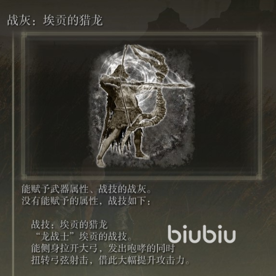 大弓类玩家的必带战灰,这是一个可以大幅提高攻击力的buff,让你打出更高的伤害上限。如果你追求更有效率的击杀敌人,那么它将提供很好的帮助。玩家在做完埃贡的支线任务后,就能直接拿到这个战灰。