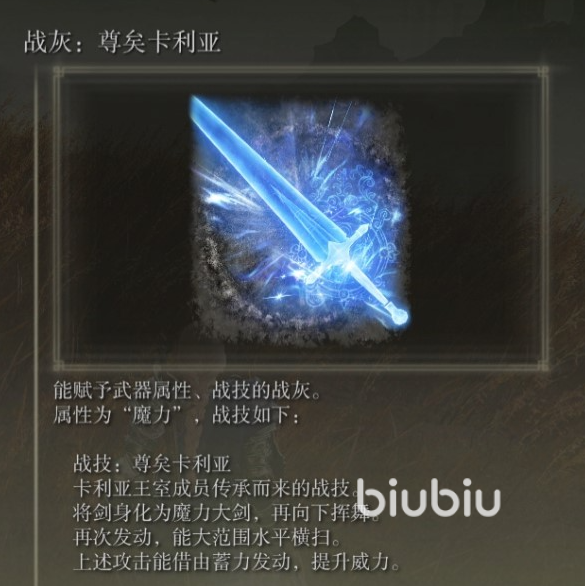 这是在教区大道地区就能拿到的战灰,适合所有剑类武器,可以让你的剑幻化为魔法大剑发动横扫,蓄力状态下有更高的威力。其特点就是威力大削韧快以及范围广,即便是传说级BOSS也吃不住几下,这让很多习惯拿剑的玩家战斗力更上一层楼,即便不用贴脸上来用战灰技能,也能迅速削减BOSS血量。