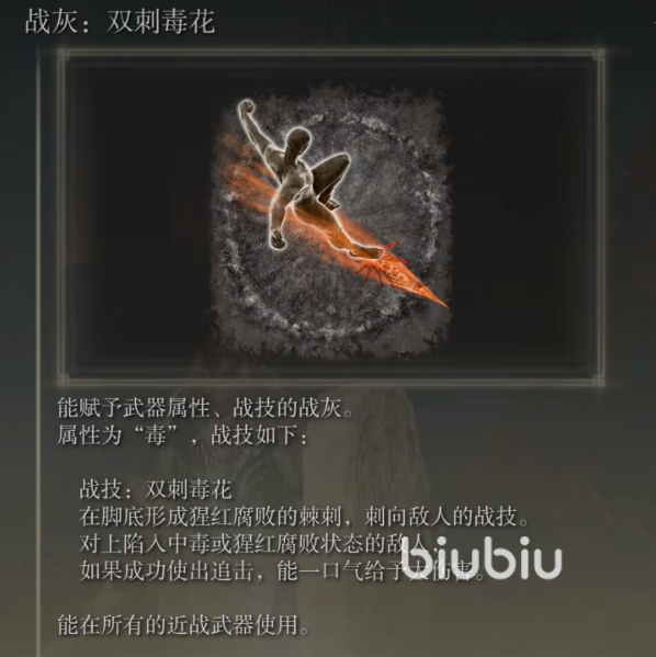 击败峡谷北方地区的粪金龟就能拿到,这个战灰所有近战武器均可使用,施放速度特别快,可以让你从较远距离刺向敌人,效果是造成伤害并叠加腐败。如果目标在腐败状态下再次被打中,会造成一次大额伤害并清空腐败。本作中腐败对于敌人来说就是一种无法净化的异常buff,持续受到伤害不说还能有易伤效果,所以这个战灰可以让你的各种BOSS战变得更简单。