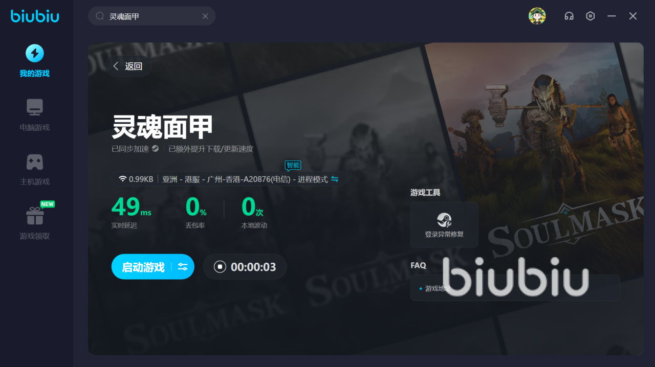 玩家是可以在灵魂面甲中游戏联机的,联机能提高资源的建筑效率,还可以结交到很多的好朋友,但是国内渠道的人数很多,所以大部分玩家都去外服进行游玩了,但是外服的网络很差,高延迟几乎是常驻的,那biubiu加速器能覆盖绝大多数的游戏渠道,让处于外服也能获得好的体验!