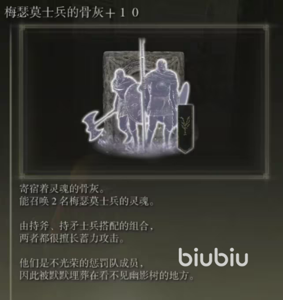 靠近石碑,就可以拾取技能梅瑟莫士兵的骨灰了。梅瑟莫士兵的骨灰还是很容易获取的,而且所召唤出来士兵伤害都很高,dlc中的一个小兵可以轻松打败好几只小怪。本体小兵都拿着长剑,部分小兵则可以自定义武器,这边建议大家换成长矛,长矛的伤害更高而且攻击范围更广。