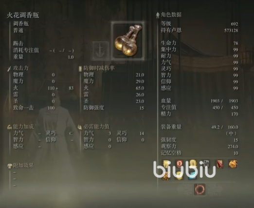 它的专属战技为“踢击”,对正在防御的敌人尤为有效,能使其失去平衡。攻击力方面,物理和魔力属性为0,火属性为110。防御时减伤率方面,物理为21%,魔力29%,火65%,雷26%,圣23%。必需能力值:力气3、灵巧14,其他能力值如智力、信仰、感应等均为0。这是调香师们持有的武器,经调整后可作为武器使用,攻击时会释放香粉,形成火花。