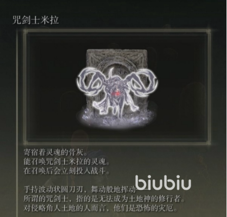 咒剑士米拉的骨灰在老头环dlc中属于第一梯队,需要消耗127个专注点才能释放。咒剑士米拉手持波动状圆刀刃,释放后不需要其他操作,也没有任何前摇,他会立即投入战斗。