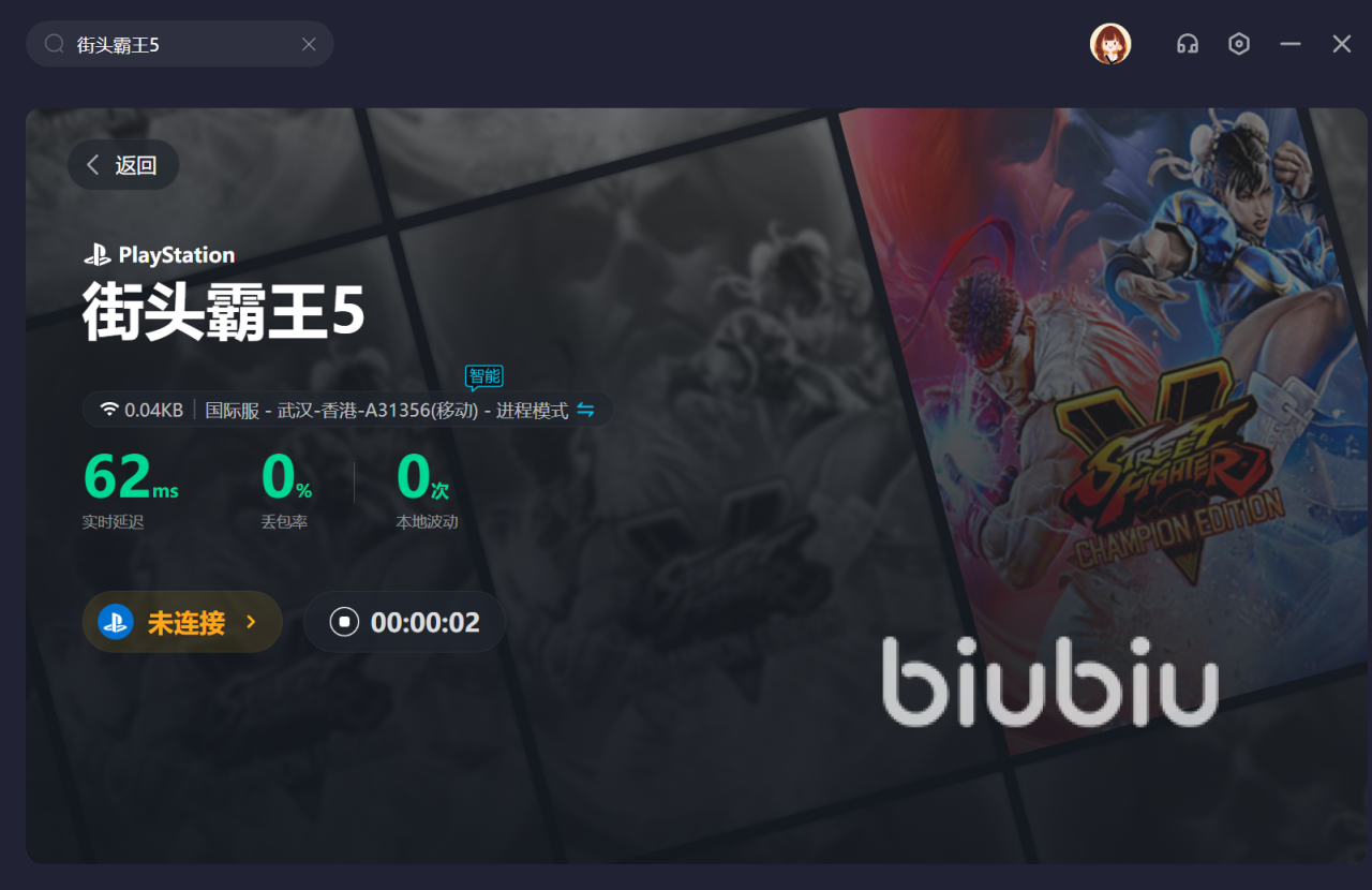 相比其他的平台来说biubiu优点可以用三个简来概括,简易,简洁,简单,清晰的面板设定没有那么过复杂的操作,一键即可启动即开即停,根本不需要玩家去做任何繁琐的设定,对于初次使用的玩家来说真的是非常的适合了。点击上方摁键就可以将其成功的下载到设备当中,搜索街头霸王5直接启动加速就可以了,游戏结束直接停止加速即可。