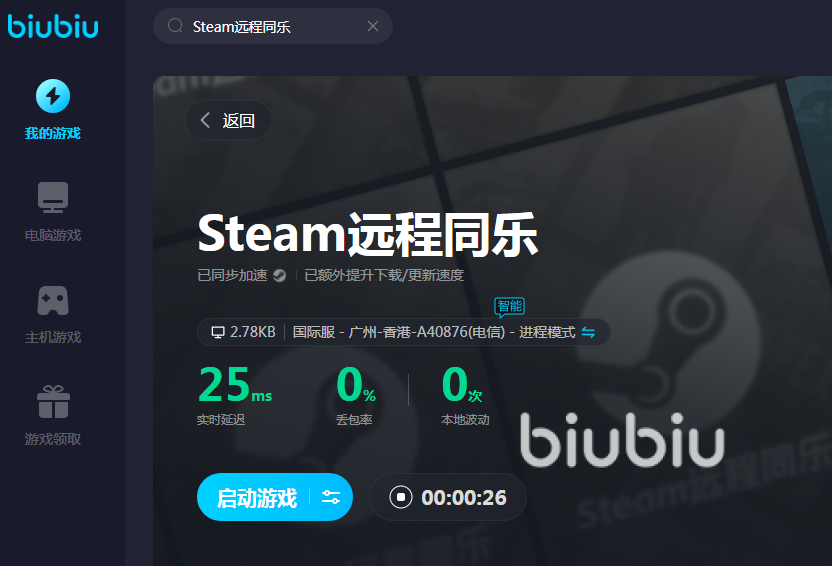 接下来大家只要点击加速按钮,就能登录上steam远程同乐了,它的网速是同步到平台上的,不仅确保大家顺利登录,还能保证游戏时候网速也是快速和稳定的。大家现在使用兑换码还能享受3天免费加速,新老用户都可以领取,只要输入【biubiu不卡顿】就可以了。