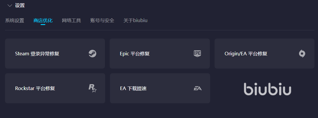网络故障当然是要先用工具来修复,biubiu针对多个平台推出了商店优化服务,而修复steam的就是这个登录异常修复的工具了,它用起来方便,操作起来特别简洁。点击修复以后系统会自己在后台进行修复,修复完毕需要大家重启一下电脑就可以了。