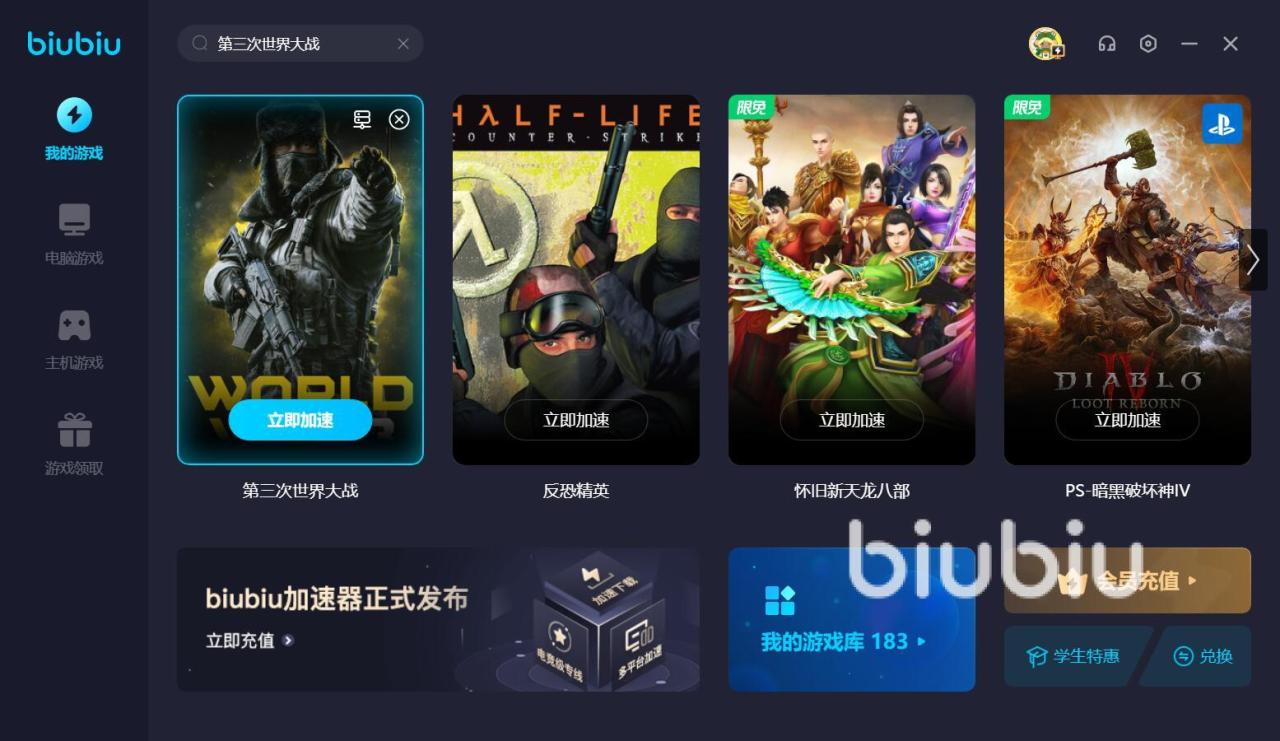 如果你比较喜欢玩国服网游的话,那么就算不开会员,也能享受到平台提供的限时免费加速服务,期间就能畅快地去体验各类网游大作了。如果你是第一次使用的新用户,那么完成注册就能领到24小时的加速时长,此外,所有用户在输入兑换码【biubiu不卡顿】之后,就能领到3天的加速时长。
