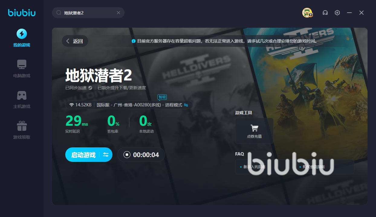 由于地狱潜者2属于海外游戏,想要在这脱颖而出的话。就需要使用biubiu,加速过后才能成为一名合格的地狱潜者。新人的话可领取24H的免费加速,令你轻松畅玩!此外【【【7月5日-8月4日】】】限时免费加速,让你每日每夜嗨玩!在非活动期间的话,新老用户均可利用【biubiu不卡顿】,即可兑换三天免费加速。若是潜行中卡顿的话,那就会被敌人识破你的位置。使用加速器后,就能避免卡顿,可以放心地混入各种地图里开启真正的战斗。