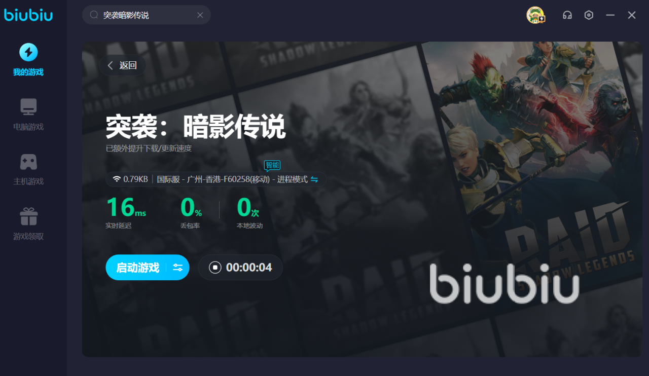 在biubiu加速器内,首页搜索突袭暗影传说的游戏名字,点击一键加速即可,体验简单快捷的游戏加速。同时,历史加速过的游戏会自动加入“我的游戏”中,方便大家下次一键打开。biubiu还经常有限免活动,用户可以体验标“限免”角标的游戏的加速。