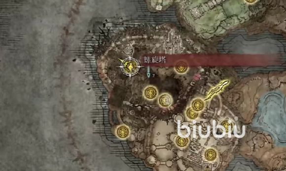 首先来到螺旋塔这个区域,然后往山顶的方向走,也就是地图上该点右边偏下一点的位置。实际到了位置之后,会发现这里都是建筑物,玩家顺着楼梯一直往右边下就可以了。