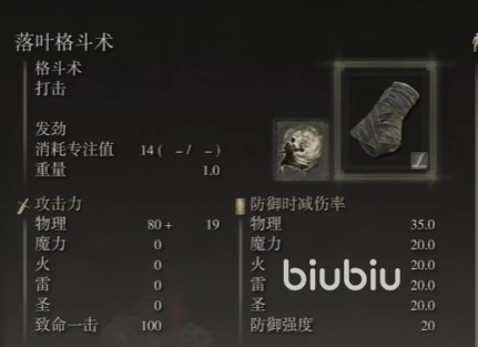 拳套武器属于格斗术的一种,主要造成的是打击伤害,所以玩家需要靠boss很近才能发挥出效果。那在选择的时候,使用落叶格斗术就不错。首先是攻击力加成之后,差不多有100,重量很低,只有1,而且在防御的时候,减伤率数值也很高。