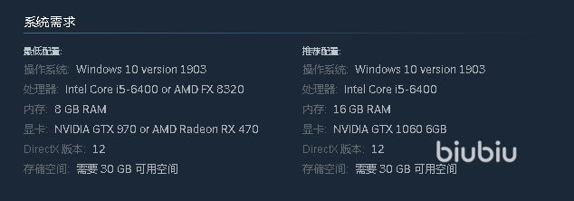 另外还需要30GB内存,若是你想以低画质玩游戏的话GTX970或是A卡的RX470,并且至少是8G内存。而高配则需要至少16GB内存以及GTX1060以上的显卡。可以看出本作的配置要求对比3A还是有些差距,只要你电脑不是特别老旧都能放心入坑。