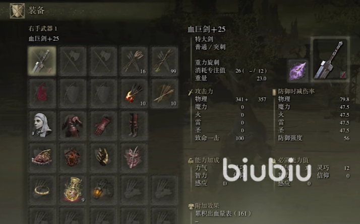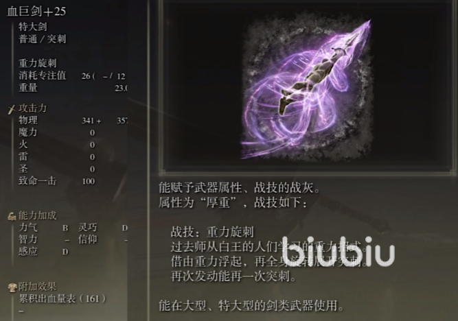 武器推荐选择血巨剑,将力气跟感应这两个数值堆到50之后,出血值是可以提高到161点的,这样武器的优点就可以发挥出来了。其次就是战灰的选择也很重要,这里最搭配的就是重力旋刺了。它是适合特大型剑类武器使用的,利用重力浮起,在浮空状态下,角色的霸体是很高的,可以免疫很多怪物的打断技能,然后全身旋转展开突刺攻击,再次发动还能够得到一次突刺效果。