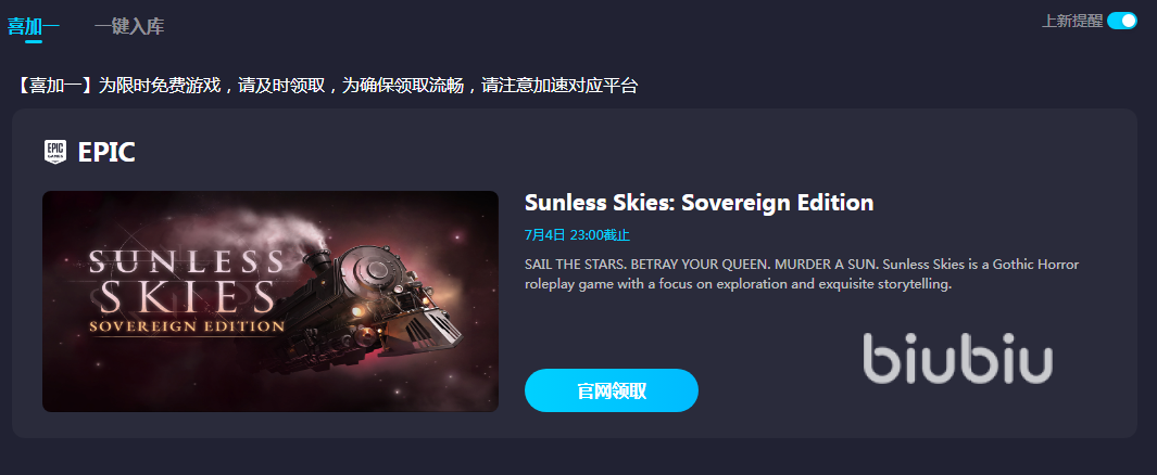 除了限免加速活动以外,biubiu还给大家带来其他福利,来到喜加一板块就能看到平台赠送的免费游戏。对游戏感兴趣的小伙伴可以根据系统提示来领取,如果当前赠送的游戏大家不喜欢,也可以勾选上新提醒,等到游戏更换以后就会收到消息推送,说不定下一个游戏就有你们想玩的。