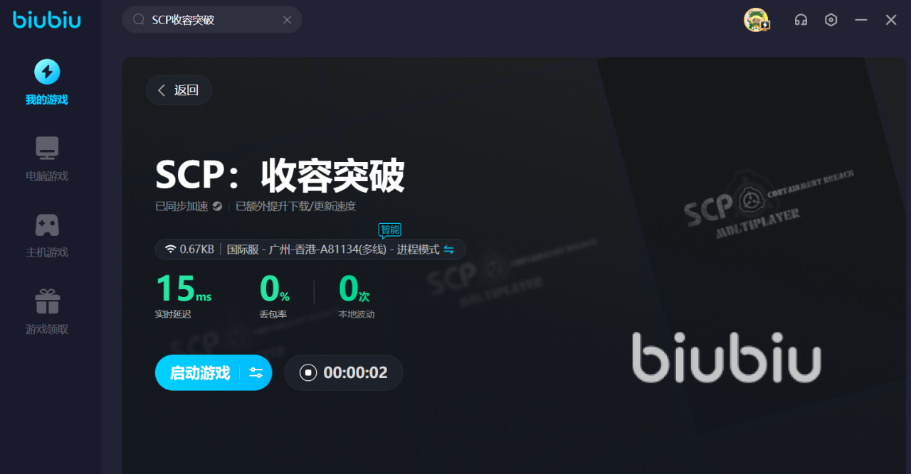 SCP收容突破游戏的服务器位于海外,因此国内玩家如果裸连,受网络延迟问题可能导致闪退、卡顿,这种情况用biubiu加速器就能轻松解决。只需要在下载安装好软件后,首页上方搜索栏输入“SCP收容突破”,而后点击游戏,选好所需加速的区服,即可进入一键加速,实时看到加速状态页,随开随停,操作非常简单。